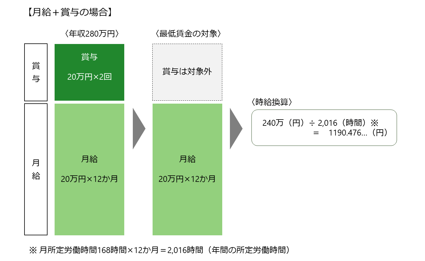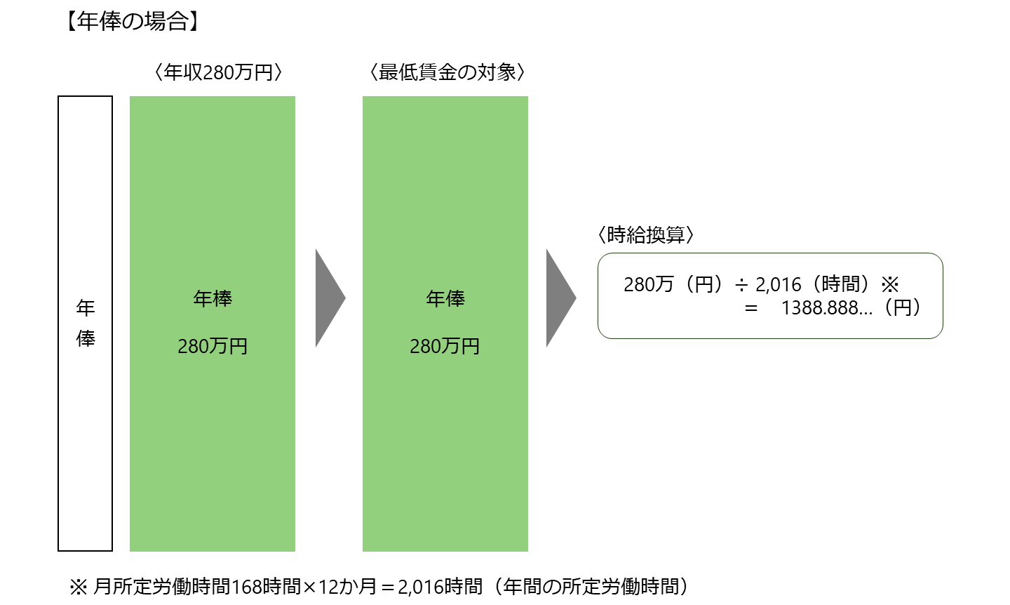 どちらも年収は280万円と変わりませんが、年棒制とすることによって最低賃金の対象額が変わります。これは、将来発生する賞与をあらかじめ定期的に分配することに他なりません。