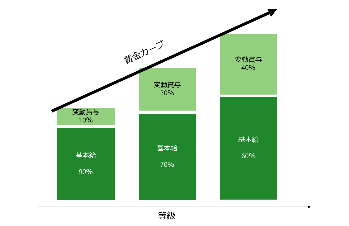 高い等級の社員の働きぶりは業績に影響しやすくなるため、等級が高くなればなるほど業績と連動する変動賞与の割合を増やすのです。
