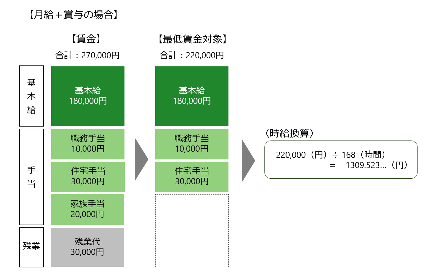 ①最低賃金対象外(残業代・精皆勤手当て等)を差し引く