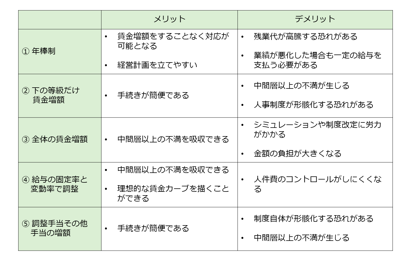 以上、賃金改定の対処方法を5つ述べました。以下に各方法のメリットとデメリットをまとました。
