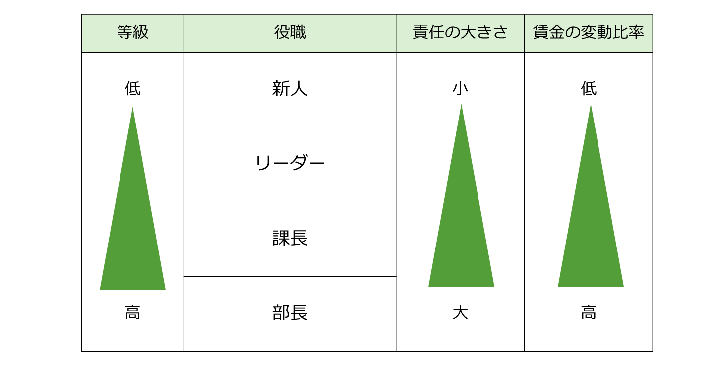 新人や仕事を覚えたばかりの社員、つまり下の等級にいる社員については、責任が小さく企業の業績と連動しにくいです。