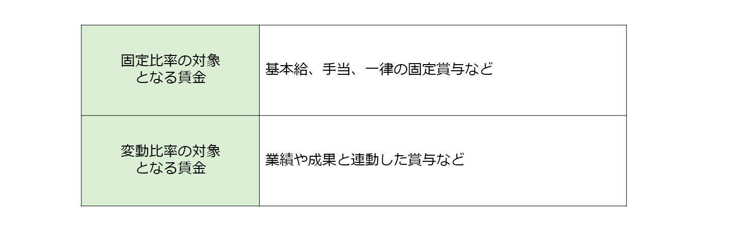 ここでいう固定比率の対象となる賃金は、月額の基本給や手当て、一律の固定賞与などを指します。また、変動比率の対象となる賃金は、業績や成果と連動した賞与を指します。