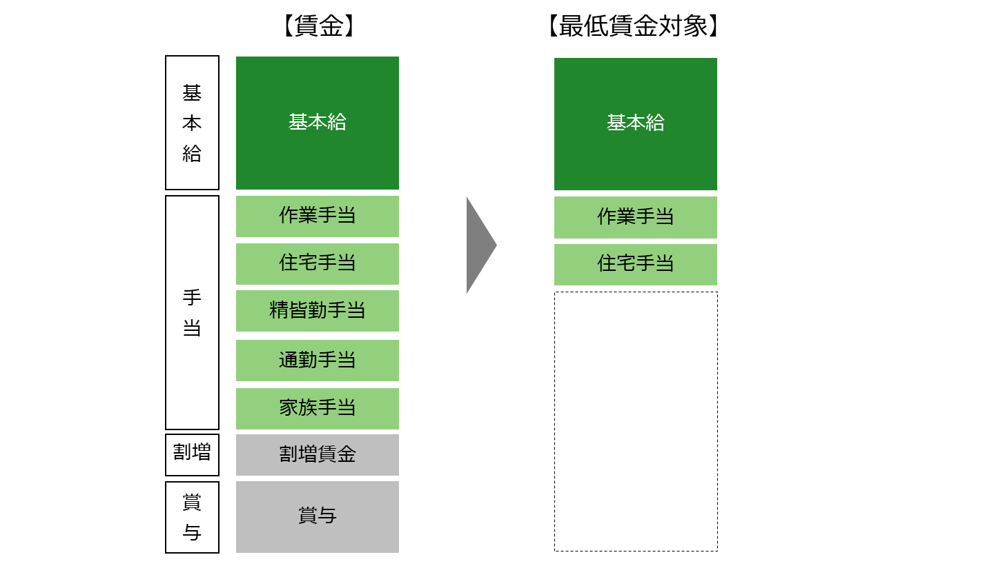 最低賃金は月々どのくらい定期的にもらっているかが基準となるため、原則として手当を含め、変動しうる精皆勤手当、通勤手当、家族手当を除外しています。