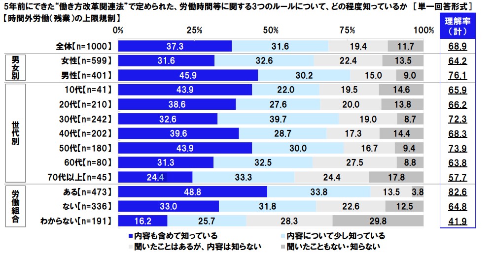 日本労働組合総連合会(連合)が2024年に実施した調査によると、働き方改革に関するルールの理解率は、組合がある職場で82.6%、組合がない職場で64.8%と、大きな差が確認されました。