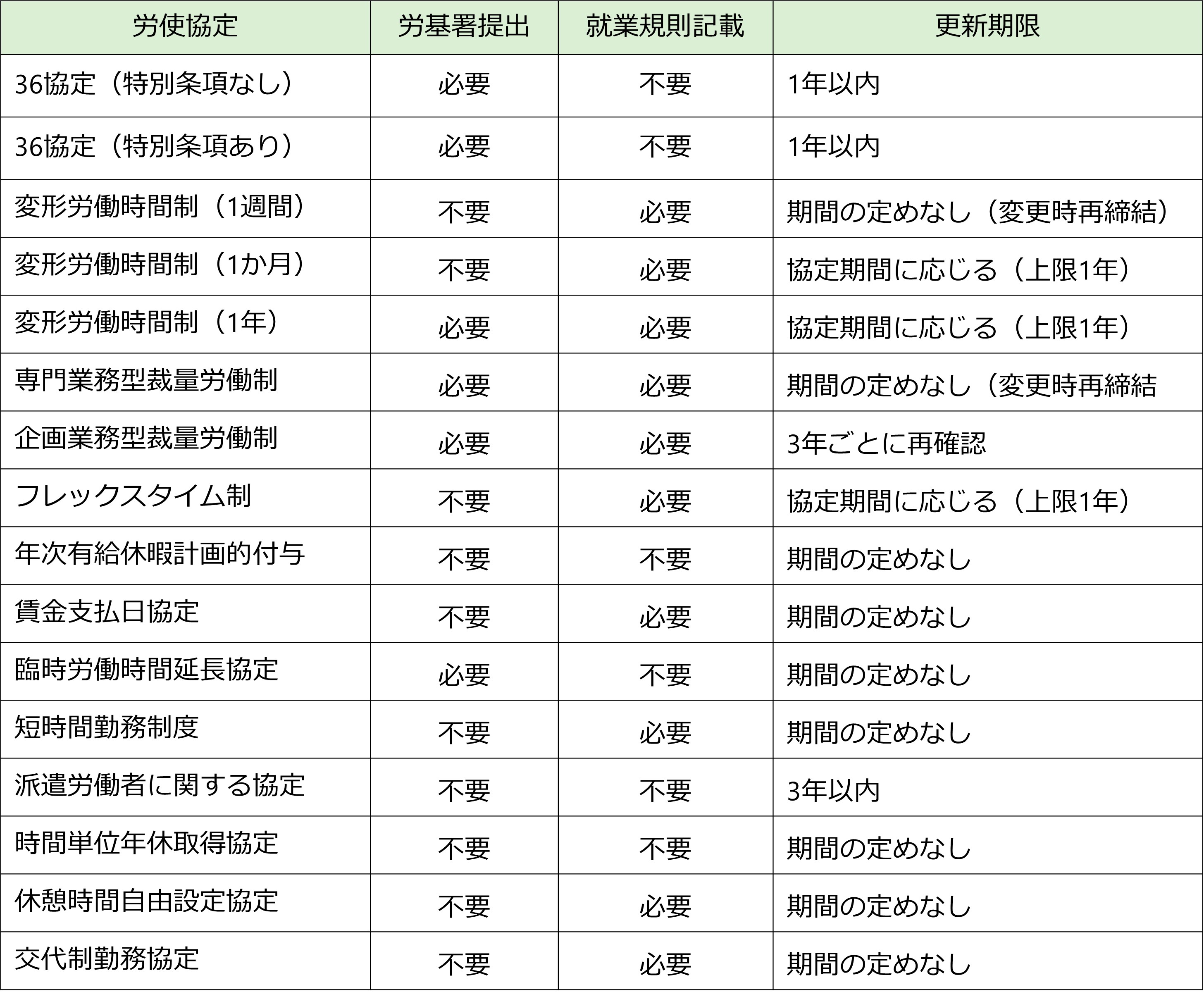 労使協定は、「労働基準監督署への提出」・「就業規則への記載」・「更新期限」の3点で分類できます。以下に代表的な協定の場合を示します。