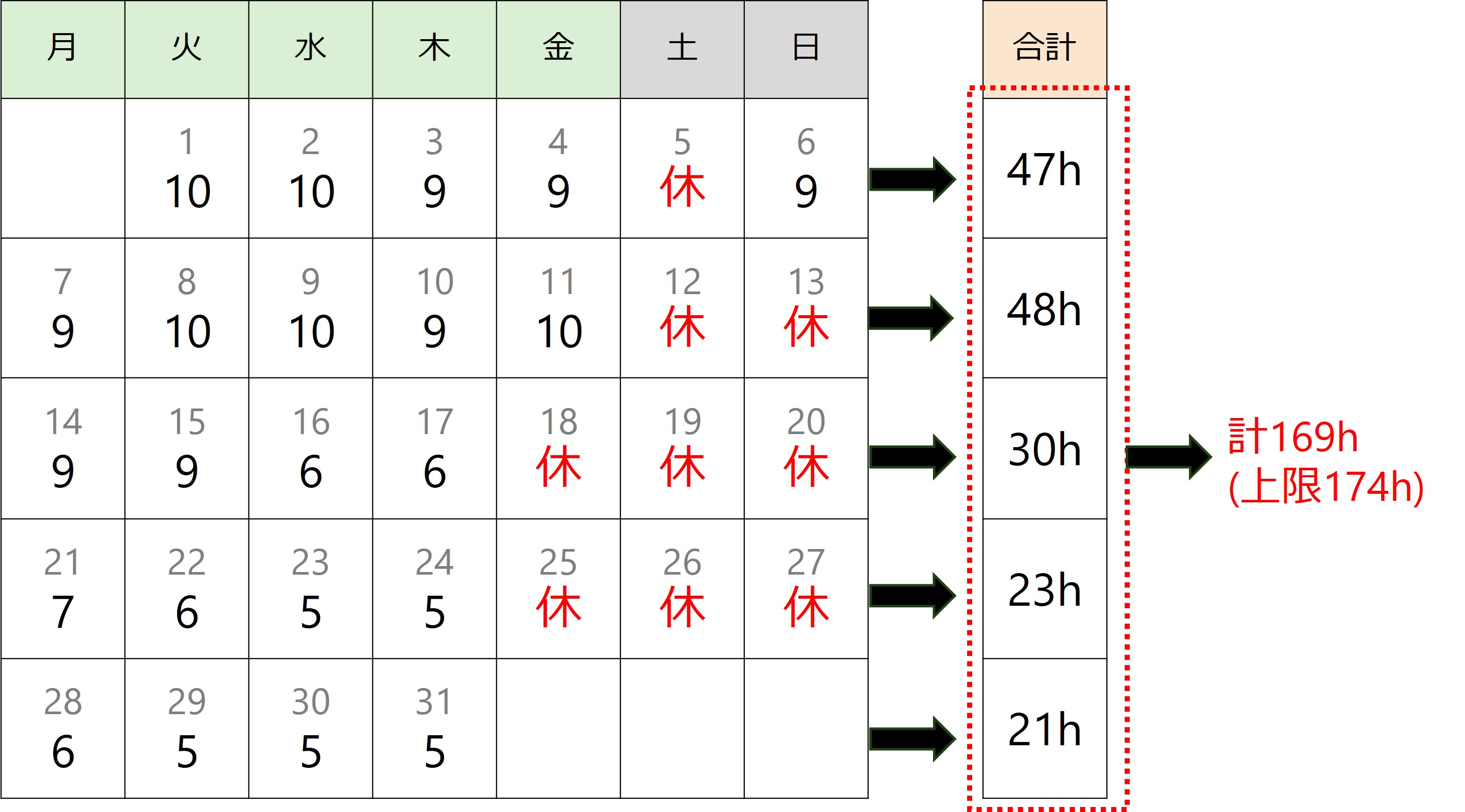 週の労働時間が平均40時間以内、1か月の合計が174時間以内に収まるように設定する必要があります。