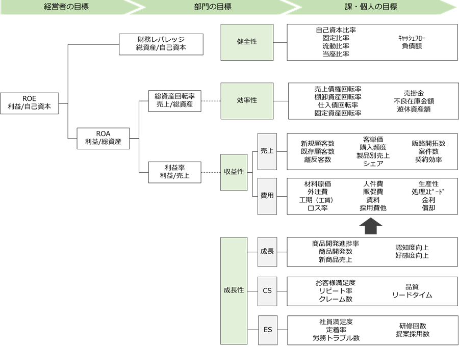 収益性が高い企業では、社員に求めるパフォーマンス(成果)が指標で示されています。(ROE、利益率、付加価値、生産性、ロス率、顧客満足度、新商品販売額など)