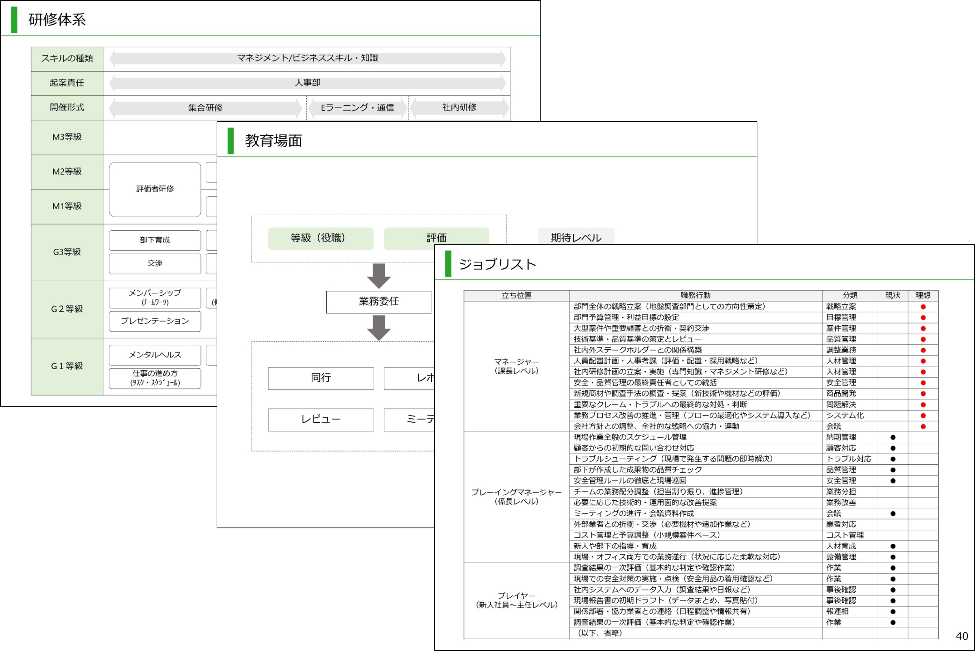「研修体系」「ジョブリスト」「OJTの場面」の設計を行います。