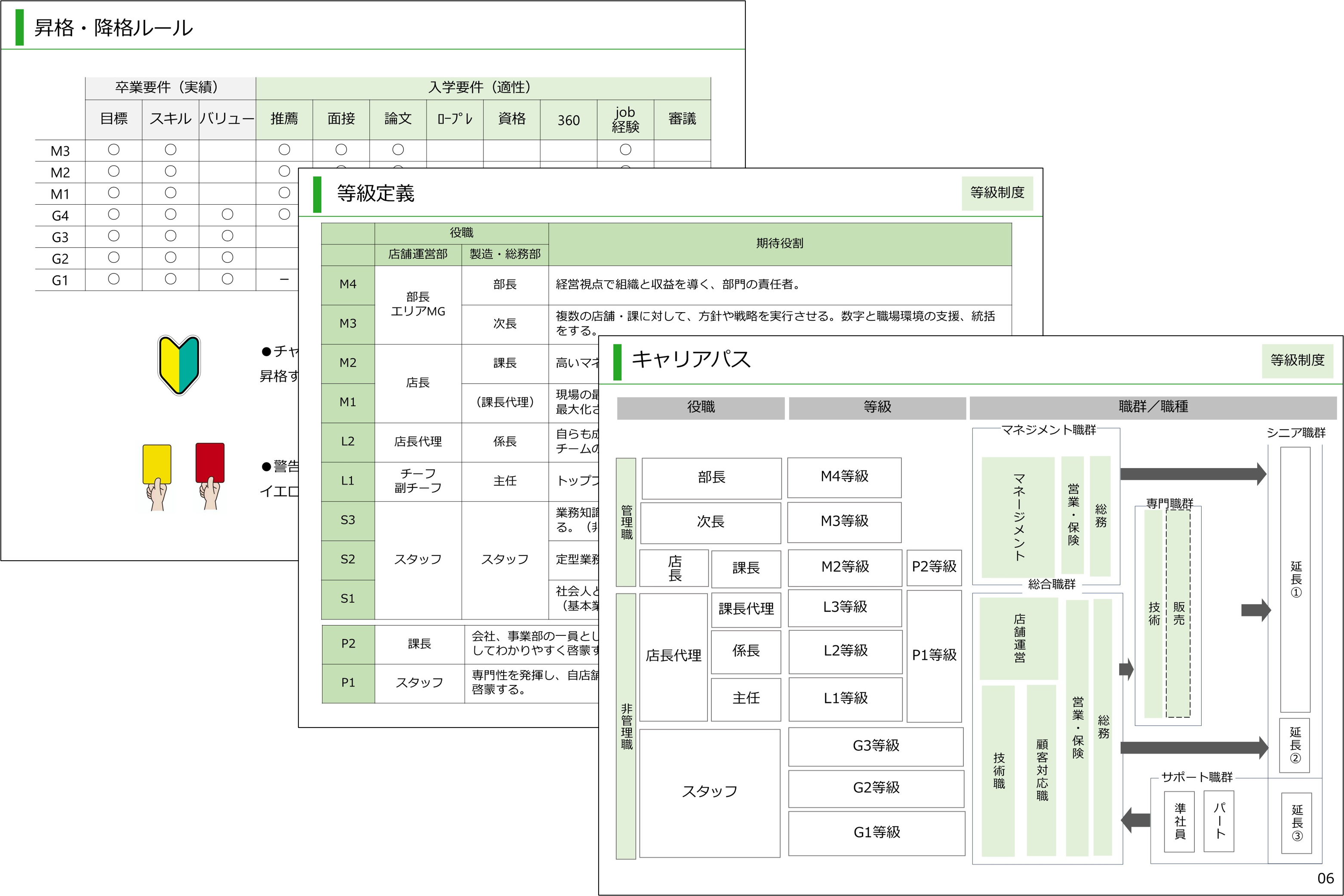 特に、等級や評価を上げるために求められるジョブや経験をリスト化し(ジョブリスト)、教育するフローや方法を明確にすることで、等級制度、評価制度を運用にのせていきます。