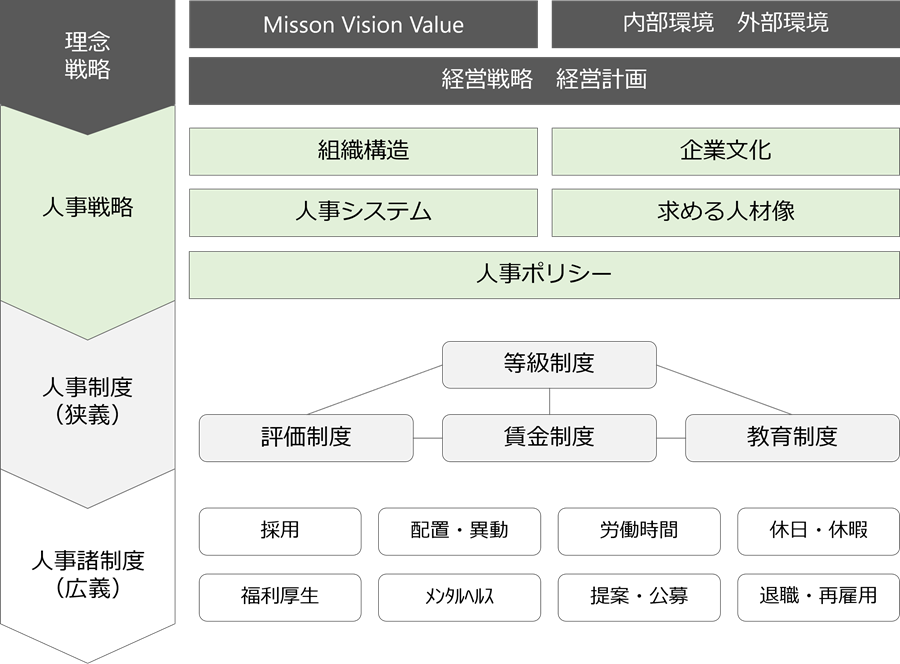 ※人事ポリシー:「人」や「組織」に対してどのような考え方を持っているかを明文化したものです。これは、採用、育成、評価、報酬といった人事施策を、経営理念や組織目標と一貫性を持たせて運用するための基本的な指針となります。