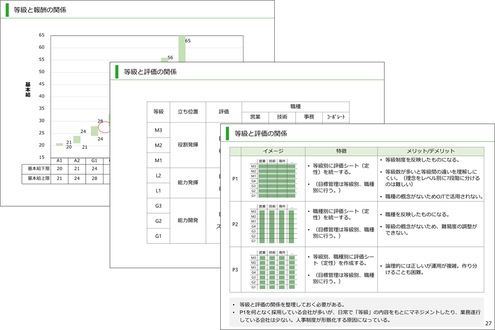 等級制度の内容が組織運営の実態と大きく乖離していると、キレイな制度を作ってもうまく運用にのらないため、組織運営の実態(組織図、レポートライン、管理指標、管理スパン等)を分析しながら設計していきます。