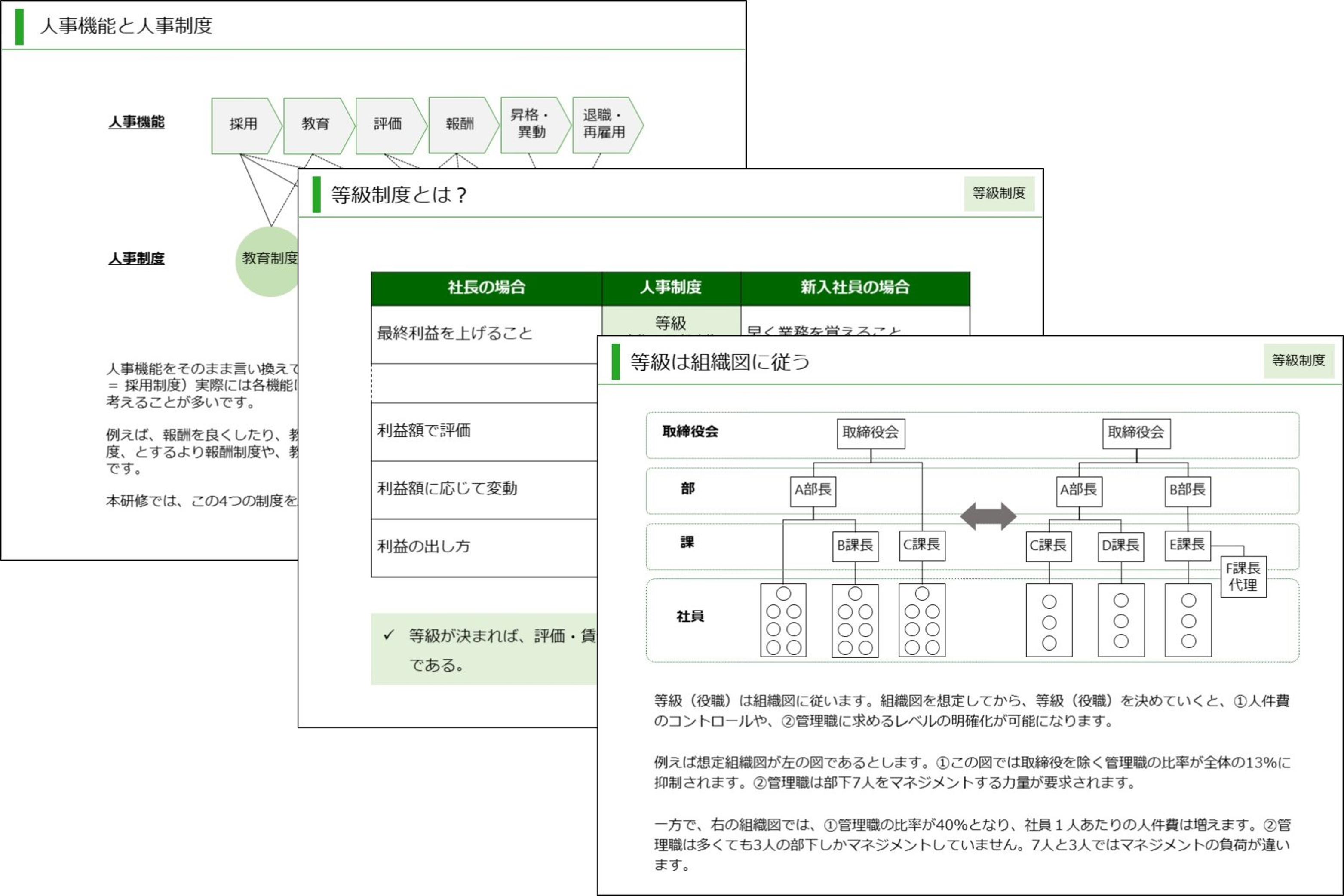 内容はクライアントごとにカスタマイズしますが、自社の人事制度理解、評価に関する知識の学習、目標設定の演習、フィードバック面談の練習、評価調整会議の練習などを行います。