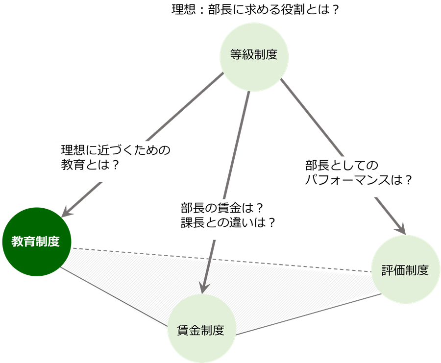 等級制度や評価制度を作ってお終い、では制度は絵に描いた餅になってしまいます。紙に「●等級にはリーダーシップが必要」と書いたところで、リーダーシップが強い人材が育つことはありません。