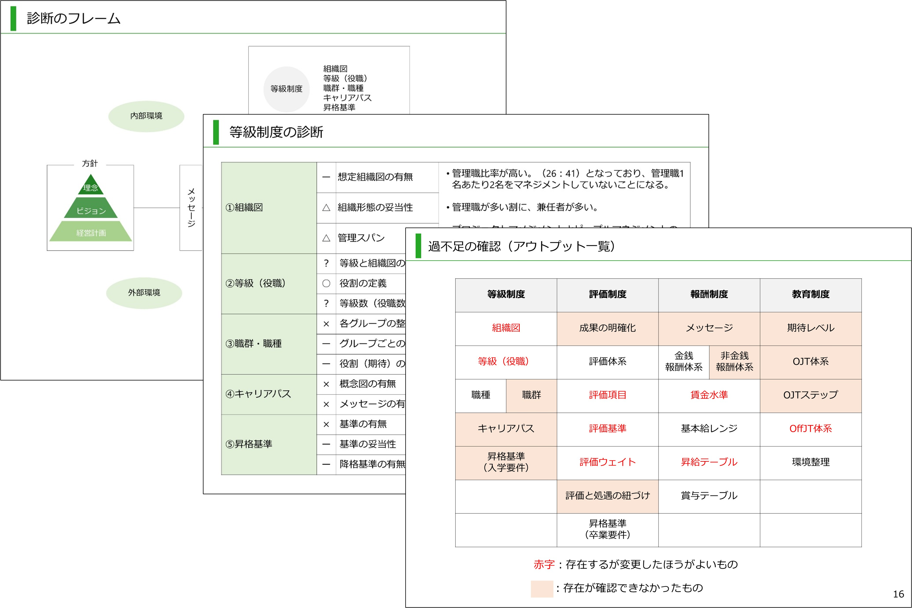 現人事制度の完成度は高いのか、今の経営環境や経営戦略に合った内容になっているのか、運用レベルは高いのか、等級・基本給・手当など移行に伴い留意すべきポイントはどれぐらいあるのか。こうした点について網羅的に診断を行います。